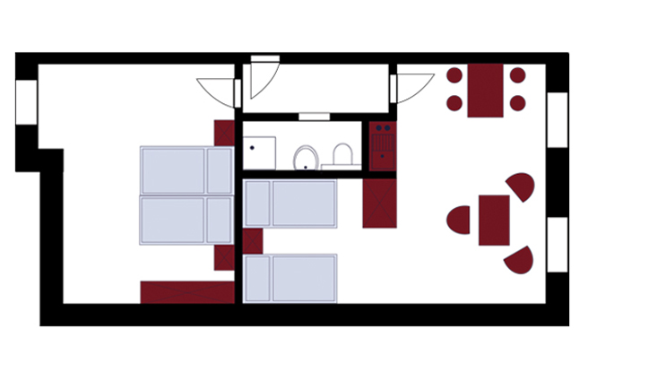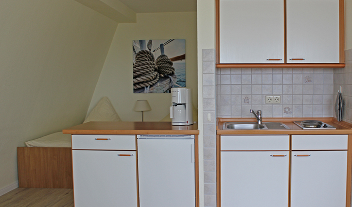 Wohn- / Schlafraum mit zwei Einzelbetten, gemütlicher Sitzecke, Pantryküche und Essplatz für 4 Personen