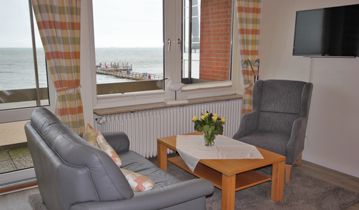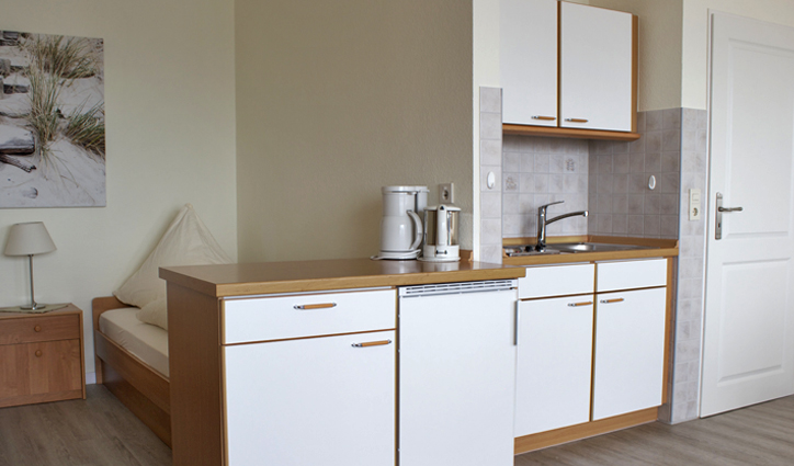 Wohn- / Schlafraum mit zwei Einzelbetten, gemütlicher Sitzecke, Pantryküche und Essplatz für 4 Personen, Flachbild-TV, Radio